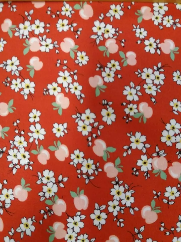 Sommerfriskt bommulsstoff med epler og blomsterbuketter, 110 cm breitt.
